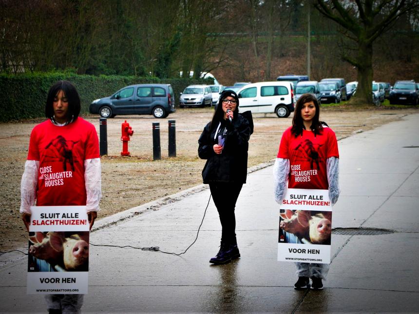 Vijf inspirerende speeches werden verzorgd door Bite Back, het Oevelse buurtcomité, Vlaams parlementslid Hermes Sanctorum en door onze campagnecoördinator Els Van Campenhout: “Varkens zijn voelende, levende wezens die even intelligent zijn als een driejarig kind. We staan hier letterlijk voor een gebouw dat geschiedenis is. De toekomst is plantaardig en slachthuizen zijn passé.”