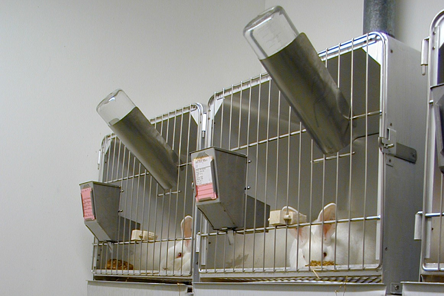 - Maximaal 92 konijnen worden vier weken lang gebruikt in een experiment waarbij een ontsteking in één oog wordt veroorzaakt. De konijnen krijgen een staafje in het oog dat een medicijn vrij geeft. De proefdieren worden 10 à 15 keer onder sedatie gebracht. De dierproefnemers verwachten dat 10% van de proefdieren het einde van het experiment niet haalt.
