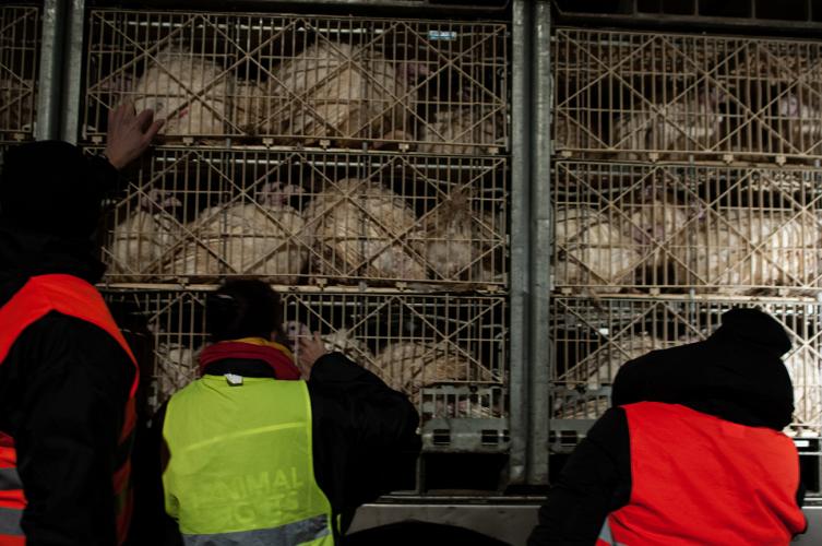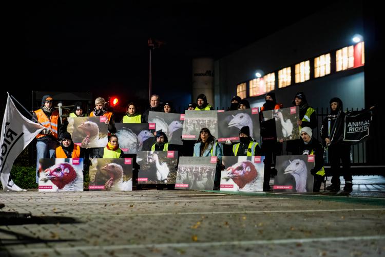 Zo’n 25 actievoerders verzamelden bij Volys Star om 3 transporten met kalkoenen op te wachten tijdens een ijskoude nacht. In één transport passen zo'n 1500 kalkoenhennen. De kalkoenen komen tijdens hun korte bestaan nooit buiten. Het enige moment dat de kans krijgen om de verse buitenlucht in te ademen is tijdens de rit naar het slachthuis.