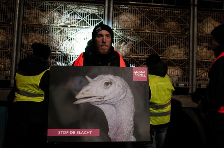 Animal Rights campagnecoördinator Els Van Campenhout: “Vanaf het moment dat kalkoenen geboren worden tot ze sterven zitten ze op elkaar gepropt in stallen zonder daglicht, zonder medische verzorging, te wachten op de dood. Wij brengen de dieren een laatste groet en laten hun lijden niet ongezien voorbijgaan.