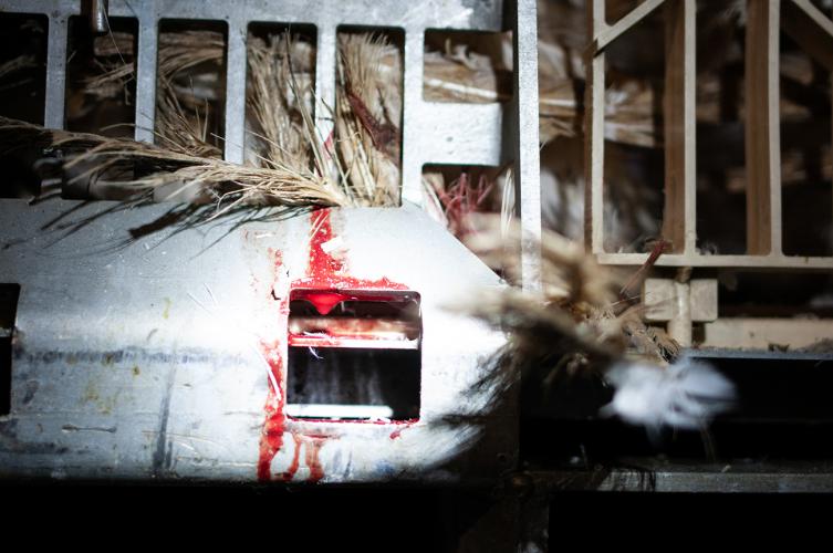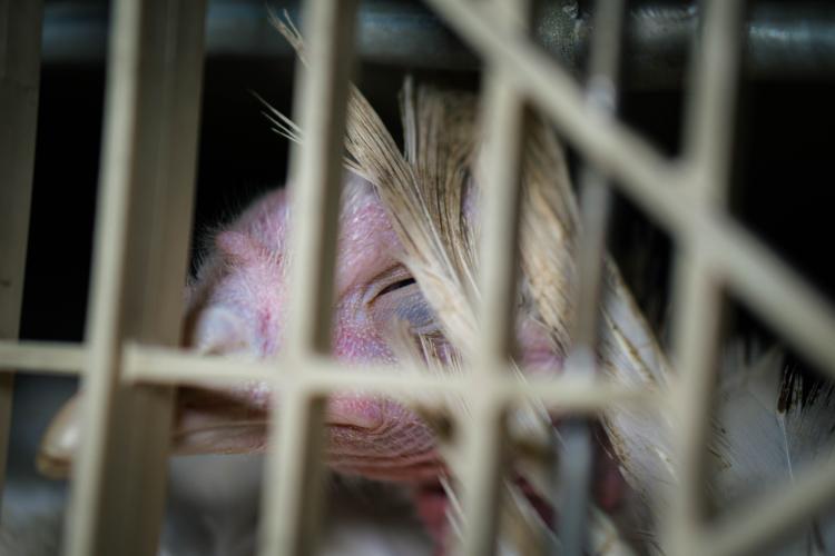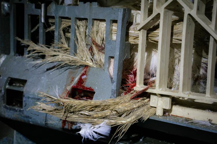 We zien hoe gebroken veren tussen de spijlen van de kratten uitkomen. Sommige kratten waren bebloed. Het leed van de kalkoenen in de vleesindustrie is eindeloos.