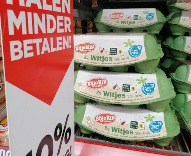 Albert Heijn verkoopt de 'vrije-uitloopeieren' niet in de winkels, maar adverteert ermee op de website. Wie de aanbiedingen van 'Blije Kip' voor de week van maandag 9 mei bekijkt, ziet als omschrijving: "Vers gelegde vrije uitloop eieren van kippen met een onbezorgd leven. Beschut in een overdekte ren of lekker naar buiten wanneer ze maar willen!"1