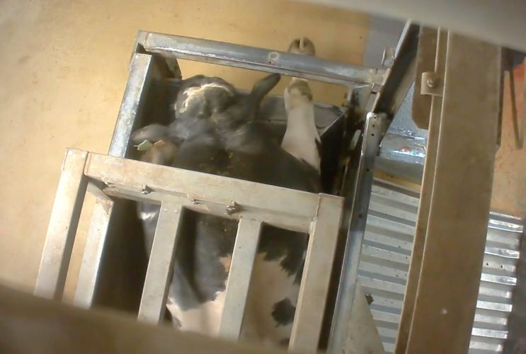 Animal Rights filmde de doodsangst van runderen in de bedwelmingsbox. De dieren kunnen vanuit de box ervaren hoe hun soortgenoten opgetakeld en gekeeld worden. Er zijn runderen te zien die in volle paniek pogingen ondernemen om uit de box te klimmen.