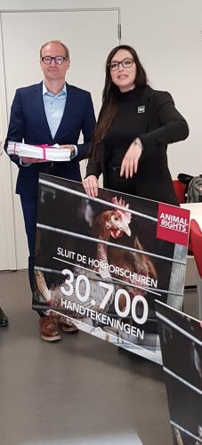 Vanmiddag op 11 april heeft Animal Rights 30.700 handtekeningen aan Vlaams minister van Dierenwelzijn overhandigd. De petitie werd overhandigd om betere condities te krijgen voor de leghennen. Een allereerste stap is de afschaffing van het kooisysteem. “Wij laten zien met deze handtekeningen dat het niet meer van deze tijd is om hennen op te sluiten in kooien,” aldus campagnecoördinator Els Van Campenhout.