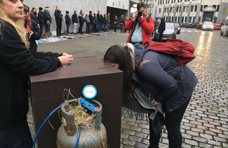 De actievoerders hadden een gaskist meegebracht die gebruikt wordt voor het doden van nertsen. Door een opening in de kist konden voorbijgangers beelden bekijken van nertsen die een gruwelijke verstikkingsdood sterven voor de productie van bont. Deze beelden werden eind vorig jaar door Animal Rights gefilmd in één van de zeventien Vlaamse nertsenfokkerijen. 1