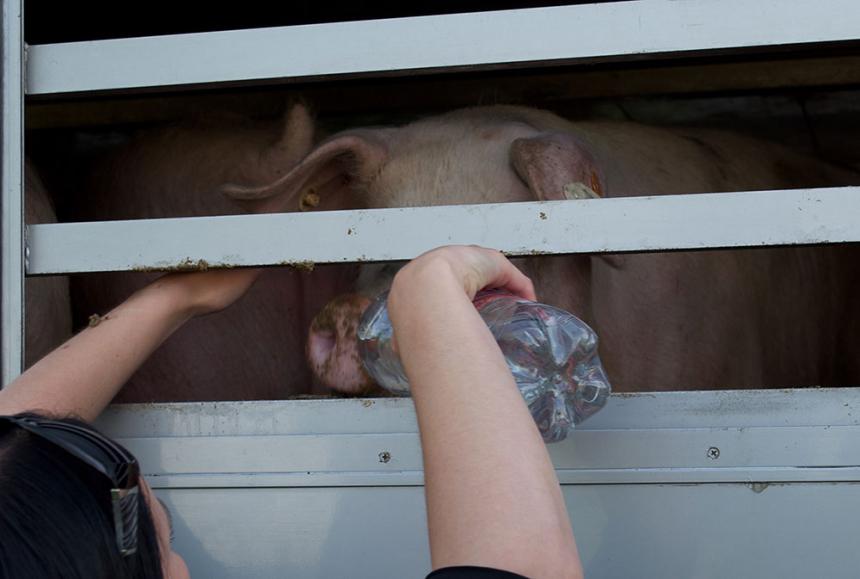 Animal Rights organiseert een vreedzaam protest voor de rechten van dieren. Vorig jaar werd ook al geprotesteerd bij dit slachthuis nadat beelden werden getoond van een varken dat met een heftruck toegetakeld werd. We houden spandoeken vast, geven de varkens water en filmen de dieren in de transportwagens. Lucas: 'Onze actie is een noodkreet aan zowel de consument als de politiek. Eet plantaardige producten. Deze zijn diervriendelijk en een stuk duurzamer.'