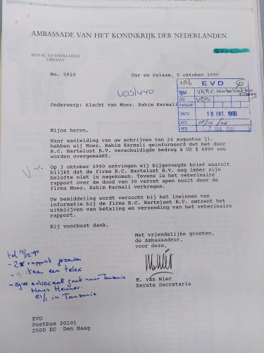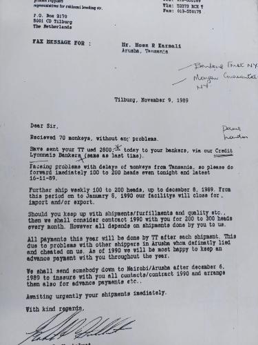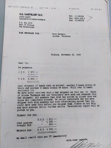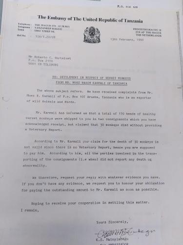 Wel stuurt Roberto Hartelust op 11 januari 1990 een brief aan E. Saleh van de overkoepelende Tanzania Wildlife Exporters Association in Dar Es Salaam, om deze te informeren dat de aapjes die op Schiphol in transit waren niet, zoals gepland, doorgevoerd zijn naar Moskou in, destijds nog, de USSR en om zich te beklagen over de exporteur.