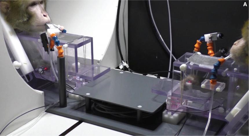 De KU Leuven publiceerde onlangs nieuwe resultaten uit een onderzoek waarin ze meten hoe verschillende hersencellen van apen op elkaar reageren tijdens voortdurende sociale interacties. Deze interacties werden geforceerd door twee met elektroden geïmplanteerde apen urenlang recht tegenover elkaar in primatenstoelen te fixeren, zoals op de foto hierboven te zien is. 1 Het kost de apen veel moeite om de voor hen onnatuurlijke opdrachten voor het beeldscherm aan te leren en uit te voeren.