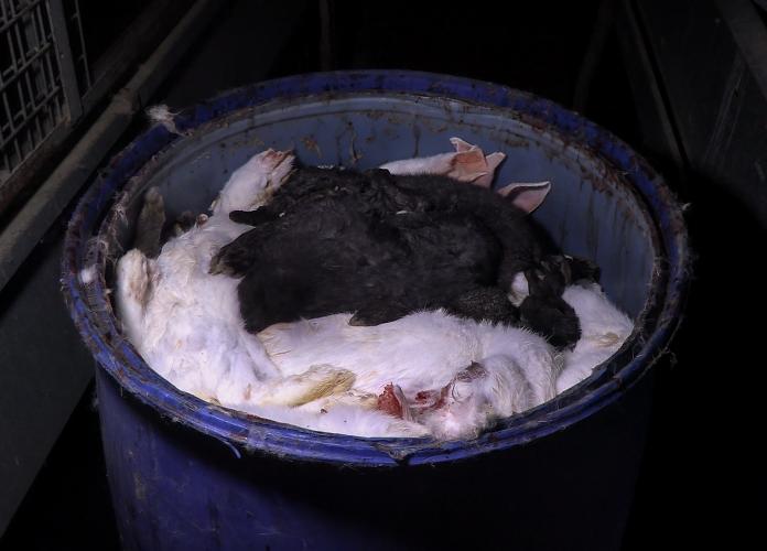 Een karkas in een kooi verkeert in verregaande staat van ontbinding. Aan de wettelijke verplichting om de dieren tweemaal daags te controleren en kadavers te verwijderen wordt duidelijk niet voldaan. Nog meer dode konijnen vinden we in propvolle onafgedekte afvaltonnen tussen de kooien met dieren in, in transportkratten, bovenop de kooien gedeponeerd en zelfs halfvergaan op de grond, achtergelaten als afval.