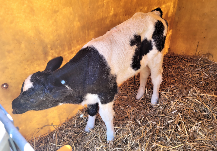 Op de afbeelding hieronder zien we een pasgeboren kalfje in een 'iglo'. Vlak voor de achterpootjes is duidelijk nog de navelstreng te zien. De foto is gemaakt op dinsdag 19 juli 2022, de warmste dag van het jaar, bij een melkveebedrijf in Brabant.