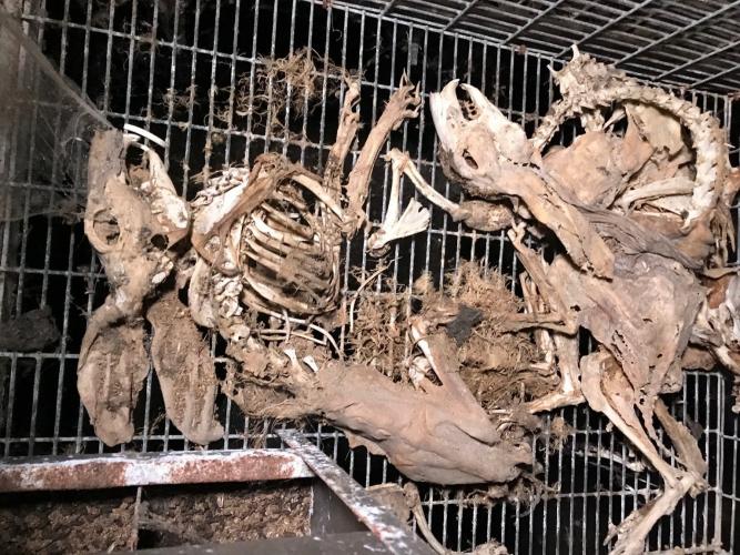 Een deel van de kooien bestaat uit zogenaamde voedster-kooien, waarin moederkonijnen hun jongen werpen. “Je moet er niet aan denken dat wanhoop deze moeders mogelijk tot kannibalisme heeft gedreven,” zegt Van Campenhout.