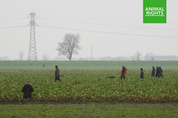 We vonden een groep met meer dan tien jagers, waaronder verscheidene kinderen. Onze aanwezigheid bleef niet onopgemerkt en dus was ook de politie weer snel ter plaatse. We legden vast hoe de jagers in drijfformatie een heel gebied ontdeden van alle diersoorten waarop gejaagd mag worden. De jagers gaan op een akker te werk als het equivalent van een sleepnet dat over de bodem van de zee wordt gehaald: iedereen die niet snel genoeg is wordt afgeslacht. Die ‘iedereen’ waren vandaag vooral hazen, fazanten en wilde eenden.