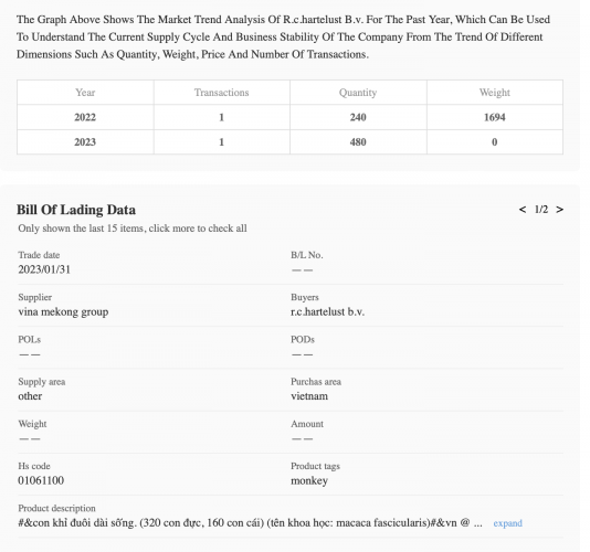 Op 30 september 2021 introduceert Hartelust zich met voorgaand verhaal in het Engels bij een @minbuza.nl adres. Uit het antwoord blijkt dat het om de Nederlandse ambassade in Vietnam gaat. Hartelust: “We import on a normal service from CHINA P.R.C. and Mauritius. However due to COVID-19 all exports have been on hold for export from origin. It has come to my attention that from Vietnam Export of Bred [primates] (Cynomolhus / Macaca Fascicularis) is permitted. My question is, that perhaps you can assist us and contact with following to open export to the EU as it is of great importance to the Scientific Research and Universities to obtain these Primates. As we have sent requests to Vietnam, but up to date no reply.”