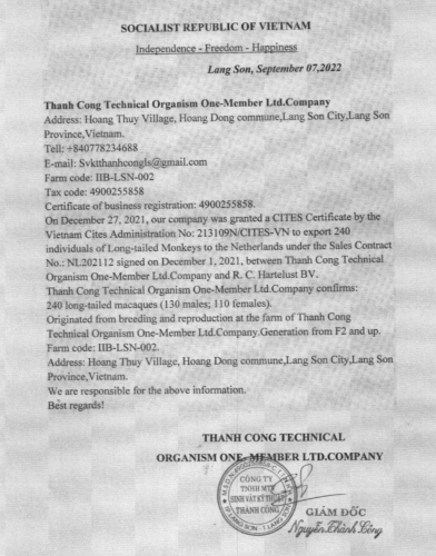 Het enige wat Hartelust weet te overleggen is een verklaring van 3 oktober 2022 waarin het Vietnamese ‘department of agriculture and rural development’ bevestigd dat het bedrijf “has raised and developed long-tailed monkeys (Macaca fascicularis) at its farm from F2 onwards.” 'F2' wil zeggen in gevangenschap geboren uit in gevangenschap geboren ouderdieren.