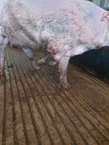 “4 zeugen mank 3 poten, geen steunname en pathologisch letsel. Klopnr FR33VHY en FR29NU1 [Franse varkens]. Geslachtsrijpe beer niet gescheiden van zeugen in de wachtruimte, samen gelost. 1 zeug exungulatie [loslaten de klauw aan de basis].”