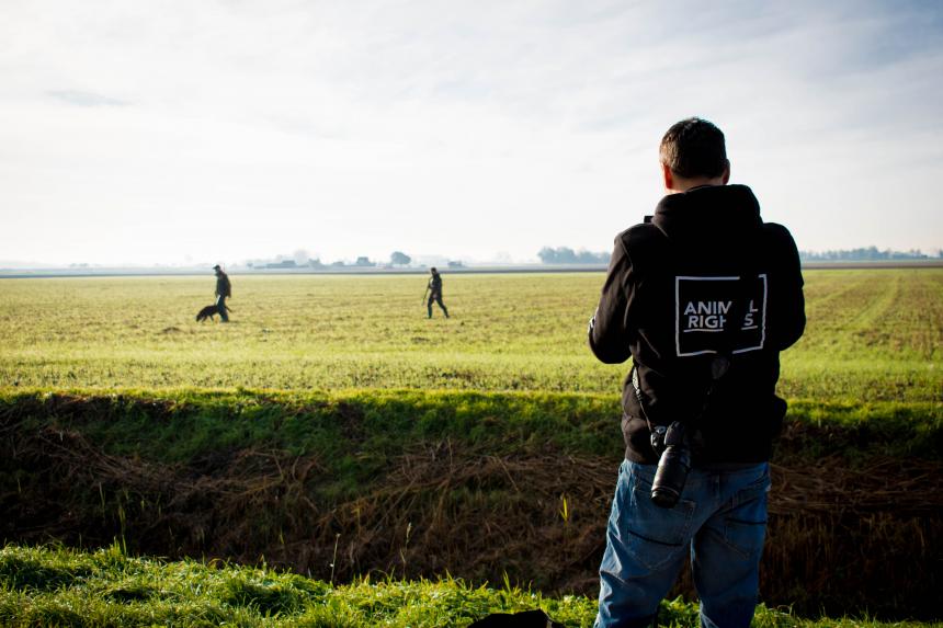 De Hunt Saboteurs voeren sinds de opening van het jachtseizoen, op 15 oktober, actie in het veld om zoveel mogelijk dieren te redden. Wijling: “We blijven op de openbare weg en filmen de jacht. Met toeters waarschuwen we de wilde dieren voor de aanwezigheid van jagers. Wat wij doen werkt.”