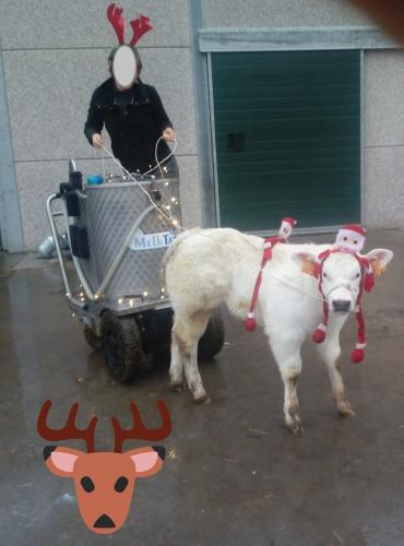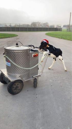 Op een foto is te zien hoe een kalfje met kerstmuts voor de melktaxi is gespannen. Op een andere foto, genomen op een ander bedrijf hangt een erg jong kalfje van slechts een paar dagen oud aan de melktaxi. Volgens Distrifarm levert dit een hilarisch tafereel op. Wie echter stilstaat bij de standaardpraktijken in de melkindustrie, ziet meteen in dat dit beeld juist erg cynisch is.