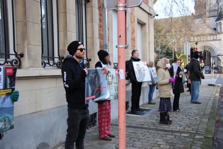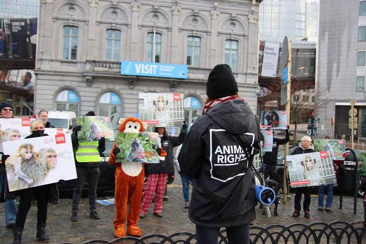 In heel Europa werd deze week actie gevoerd tegen de handel in apen uit Mauritius voor dierproeven. Animal Rights heeft gisteren een protestmars gehouden met 25 demonstranten in Brussel tegen de internationale apenhandel.1 De mars startte aan de ambassade van Mauritius en eindigde op het Luxembourgplein met zicht op het Europees Parlement.