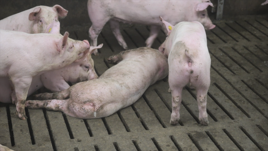 Dode varkens liggen, onbedekt, buiten de staldeur en in de gangen tussen de troosteloze hokken met varkens, vaak zonder verrijking. De stallen zelf zijn smerig met brandgevaarlijk ‘spinrag’ hangend van de plafondbalken en een mengsel van stront en urine op de vloeren; geen wonder dat veel van de varkens ook bedekt zijn met hun eigen smurrie.