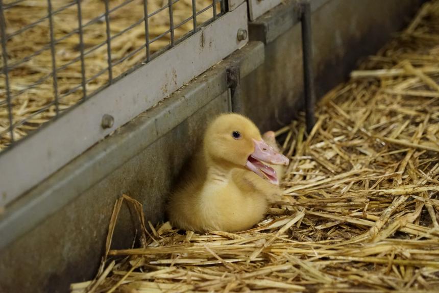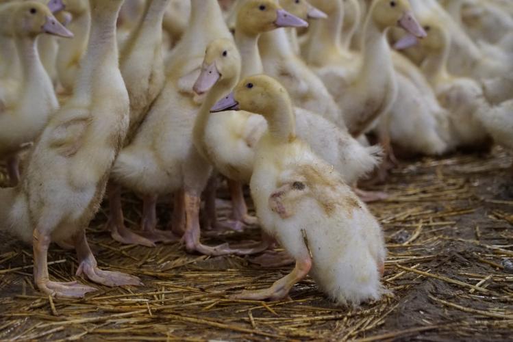Nog altijd levende eenden tussen de kadavers