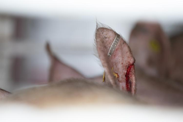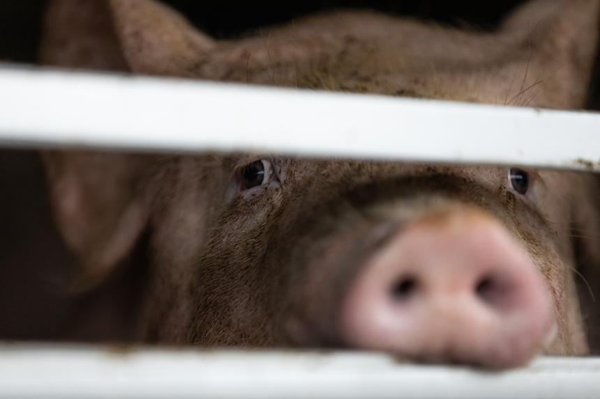 Het hoge gekrijs dat uit de vrachtwagens komt, gaat door merg en been. Er zijn negen vakken, verdeeld over drie verdiepingen (laadvloeren) en in ieder vak zitten zo'n vijftien varkens tegen elkaar aangedrukt. Het is evident dat ze bang en gefrustreerd zijn: er is nauwelijks ruimte om te bewegen, de dieren zitten onder de rode striemen. Ze bijten elkaar in de oren en de staarten. Een enkel dier heeft een flink abces. En de stank is overweldigend.