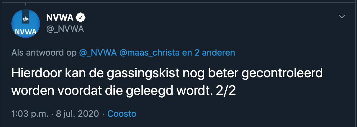"We staan er wel bij. Om herhaling te voorkomen, is de instructie aangepast. Er gaan minder dieren tegelijk in de gaskar. Hierdoor zijn de dieren beter te zien, zodat nog beter kan worden vastgesteld dat alle dieren zijn overleden." 1