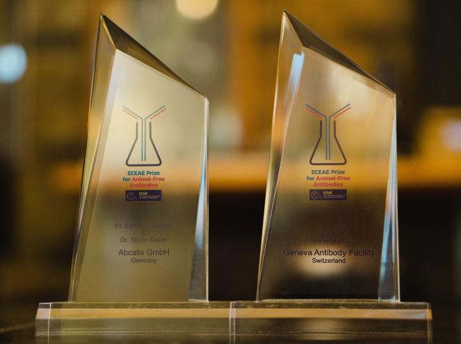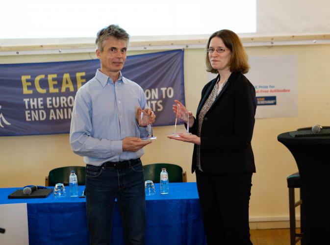 Ter ondersteuning van de "Aanbeveling inzake niet op dieren gebaseerde antilichamen" van het EU-referentielaboratorium voor alternatieven voor dierproeven (EURL ECVAM) heeft de ECEAE de enige prijs ter wereld uitgereikt voor de voorbeeldige ontwikkeling en toepassing van antilichamen zonder dieren. Tijdens de internationale prijsuitreiking gisteren in Brussel ontvingen twee uitstekende kandidaten gelijkwaardige prijzen van elk 10.000 euro. Beide bekroonde projecten zijn volledig vrij van dierproeven of materialen en dragen in hoge mate bij tot de ontwikkeling, distributie en promotie van diervrije antilichamen wereldwijd.