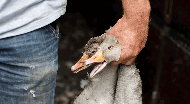 We gaan alle perken te buiten door eerst duizenden ganzen naar onze akkers te lokken om ze vervolgens te vergassen als ze in de weg zitten.