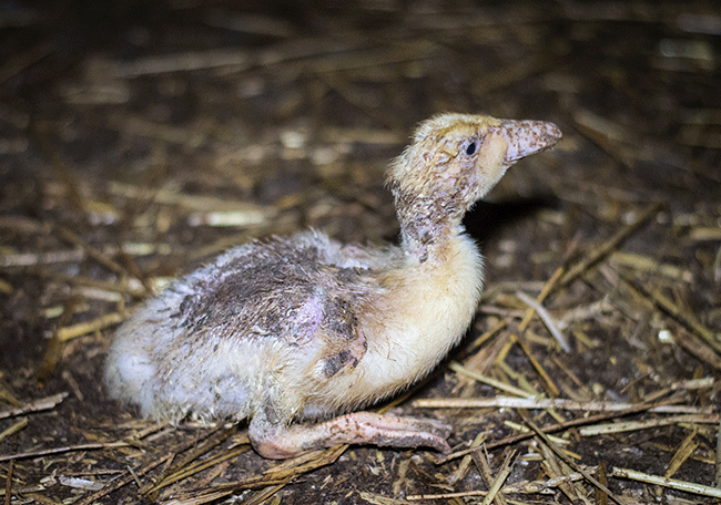 Eenden zitten opgesloten in dichte schuren en hebben geen toegang tot water.