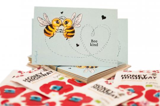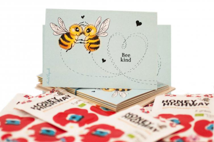 Jij en jouw vrienden en/of familie kunnen meehelpen! Dat hebben we leuk en makkelijk gemaakt met onze Bee Kind kaartenset. Je koopt hiermee een set van 5 mooie kaarten (inclusief enveloppen) en 6 zakjes bloemenzaadjes. Met elke kaart die je verstuurt kun je dus 1 zakje meesturen, zo motiveer je jouw omgeving om ook de bij te helpen. Het zesde zakje is voor jezelf!