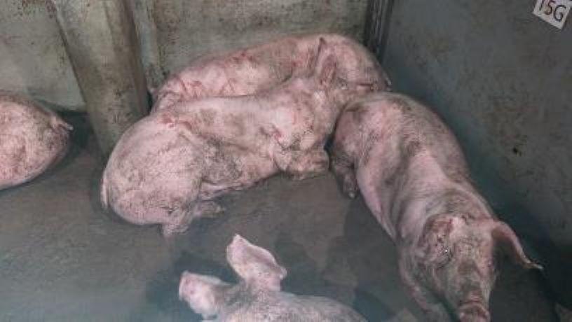 Een verzamelruimte is donker met glimmende vloer door het water dat gebruikt wordt voor het drijven waardoor varkens weigerachtig zijn om de ruimte te betreden; De vloer van opdrijfgang is beschadigd; In het laatste deel van de opdrijfgang wordt te frequent en regelmatig hardhandig gebruik gemaakt van voorwerpen om de varkens vooruit te drijven. Letsels (krassen, afdrukken) werden sporadisch op het karkas waargenomen; In het laatste deel van de opdrijfgang is er veel lawaai;