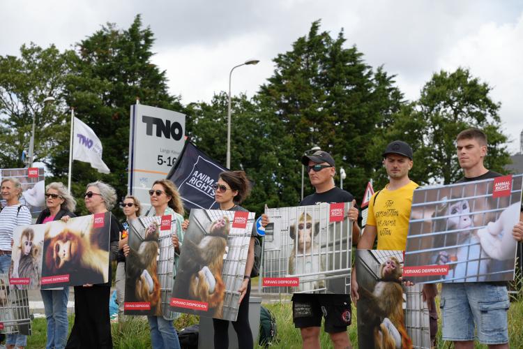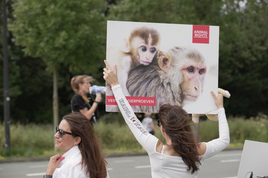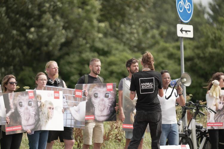 Afgelopen vrijdag 9 augustus organiseerde Animal Rights een succesvolle actie voor de poorten van het apentestcentrum BPRC. Jaarlijks worden tussen de 150 en 200 apen gebruikt in akelige dierproeven. Volgens de laatste telling zitten er 944 apen in het BPRC.
