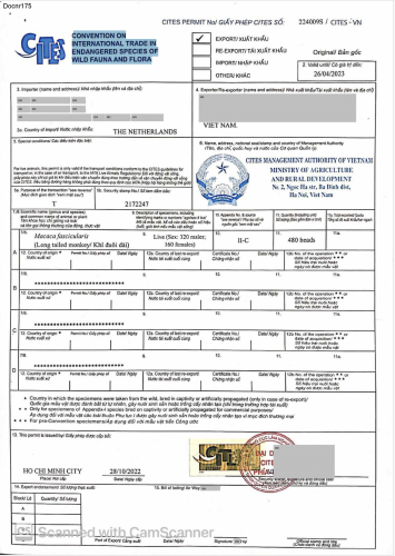 Het Vietnamese CITES (de Convention on International Trade in Endangered Species of Wild Fauna and Flora) bureau heeft hiervoor op 28 oktober 2022 een vergunning afgegeven die geldig is tot 26 april 2023 (CITES VNMK 02112022 / 224009S). Het gaat om 320 mannetjes en 160 vrouwtjes.