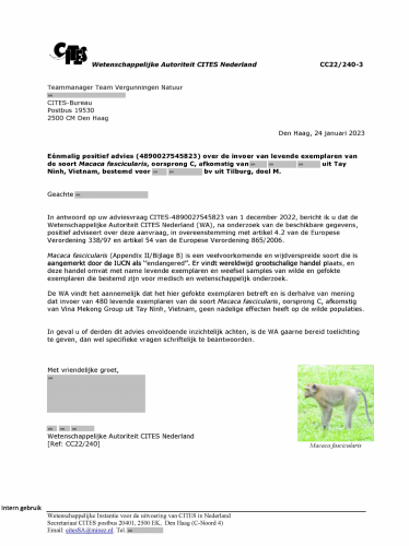 Op 24 januari geeft de WA een ‘éénmalig positief advies’ (4890027545823 / CC22/240-3) “over de invoer van levende exemplaren van de soort Macaca fascicularis, oorsprong C, afkomstig van [Vina Mekong Group] uit Tay Ninh, Vietnam, bestemd voor [Hartelust] bv uit Tilburg, doel M.”