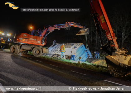 Op de Plaatweg bij Stellendam is zaterdagavond 23 januari 2021 een veewagen met schapen van de dijk geraakt. Vijf schapen komen om.