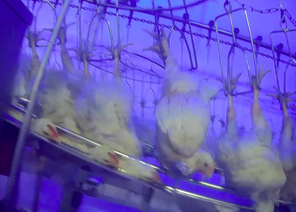 Undercover: The suffering of chickens inside Flemish slaughterhouse Nieuws: 3 november 2020 Animal Rights once again releases sad footage from a Flemish slaughterhouse. This time it concerns meat chicken slaughterhouse Nollens in the East-Flemish town of Kruishoutem. The footage is an indictment of the live 'attaching' of animals to the slaughter line and the electric waterbath stunning that is used. Animal Rights director Susan Hartland explains: "We see how a chick hanging upside down avoids both the waterbath and knife. It witnesses how the fellow chicks are electrocuted and their throats cut. The chick is then pulled out of the slaughter line and the throat is cut in full consciousness'.