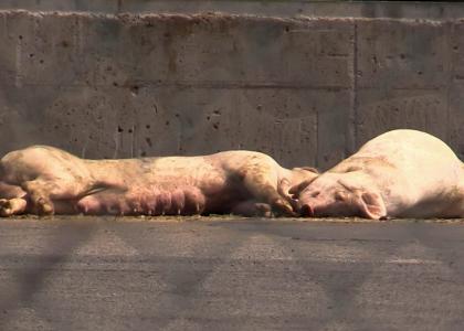 Animal Rights filmde gisteren hoe in de middag, op het heetst van de dag, nog vrachtwagens werden gelost bij Porc Meat in Zele. Onder het losplatform lagen overleden varkens als afval aan de kant gegooid.