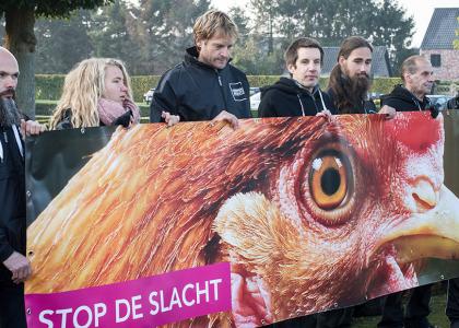 Animal Rights protest bij kippenslachterij Ravels Nieuws: 12 oktober 2016 50 activisten van Animal Rights protesteerden dinsdagochtend 11 oktober 2016 tegen het slachten van kippen bij slachthuis Pluvera in Ravels.