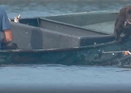 Nare beelden van de jacht met levende eenden: dieren worden met een stuk touw en een gewicht aan hun poot in het water gegooid.