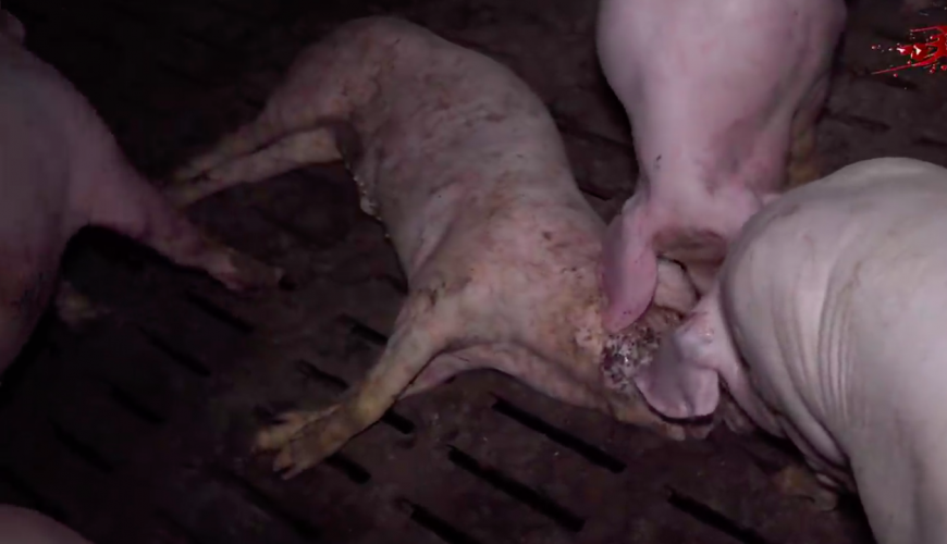We zien hoe drie biggen het aangezicht aanvreten van een dode soortgenoot. In extra videomateriaal is te zien hoe een varken bijt in het lichaam van een dode big en kauwt op het vlees dat uit het lichaam getrokken werd.