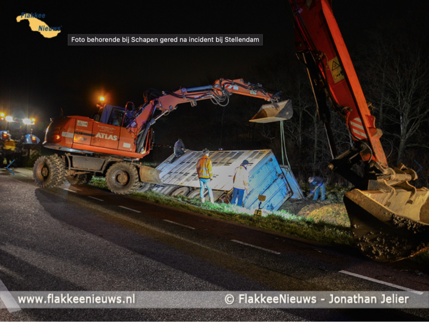 Op de Plaatweg bij Stellendam is zaterdagavond 23 januari 2021 een veewagen met schapen van de dijk geraakt. 1 Naast materieel van de brandweer kwamen ook twee graafmachines ter plaatste om de veewagen op de kant te tillen. Uit de beelden en het nieuwsitem was onduidelijk of de dieren uit de wagen gehaald waren voordat deze opgehesen werd. Dat zou natuurlijk vanzelfsprekend moeten zijn, maar sinds het ongeluk met een kuikentransport in Siddeburen op 2 december 2020 weten we beter. Daar loopt nog een handhavingsverzoek voor het mishandelen van de dieren na het ongeluk.