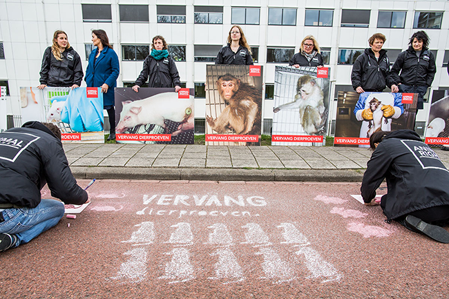 Op zaterdag 18 maart protesteerden zo'n 100 mensen bij het Erasmus MC in Rotterdam. In het grootste proefdiercentrum van Nederland worden jaarlijks meer dan 30.000 dierproeven uitgevoerd op muizen, ratten, konijnen, fretten, zebravissen, vogels, varkens en apen.