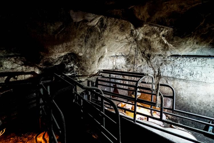 Door heel het geïnspecteerde stallencomplex hangt spinrag bezet met stof, als dichte sluiers van het plafond, wanden en leidingen naar beneden. Het vuil is innig verstrengeld met elektrische installaties zoals ventilatie en verlichting. Er is weinig fantasie voor nodig om te bedenken wat één kortsluiting-vonk hier teweeg zou brengen. “Wanneer is een stal smerig genoeg om handhavers en de lokale overheid tot ingrijpen te bewegen,” vraagt Animal Rights directeur Susan Hartland zich af.